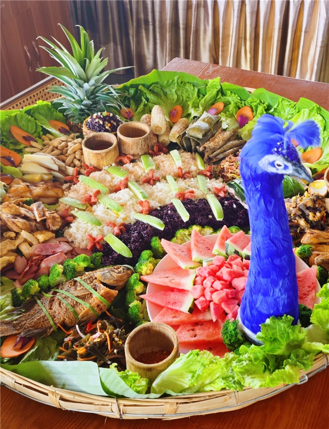餐饮推荐南腊河观景餐厅,孔雀造型的手抓饭融合山茅野菜与热带水果,网红簸箕餐用芭蕉叶盛放食材,让孩子爱上原生态美食。