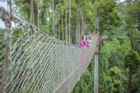 空中走廊体验:踏上空中走廊,仿佛站在雨林巨人的肩膀上,脚下是苍翠茂密的雨林林海,视角震撼又独特。行走在悬空的走廊上,能清晰俯瞰雨林冠层的错落景致,聆听林间鸟鸣,感受微风拂面,沉浸式体验“天空近在咫尺,雨林尽在脚下”的奇妙感觉。这里不仅能收获绝美的高空观景体验,更能直观感受雨林生态的立体层次,解锁与地面徒步截然不同的雨林视角。