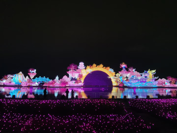 现代技术,让传统‘活’起来。 不同于传统静态灯彩,本届灯会在保留手工工艺核心的同时,系统引入智能控制、动态灯效与声光联动技术。以超220米水上灯组“桃海仙踪”为例,其整体结构仍以传统灯彩骨架为基础,但在水面环境、风力变化与夜间反射条件下,对防水材料、电路分区与亮度层级提出了极高要求。制作团队需在施工现场反复测试,确保灯组在大尺度展示中既安全稳定,又保有细腻层次。