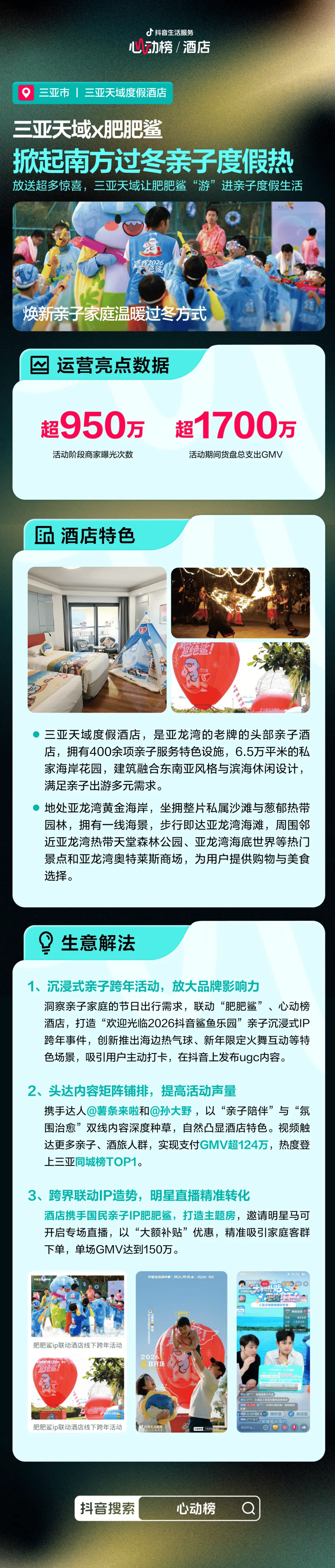 在元旦期间三亚天域以“创造独特家庭回忆”为主线,联动国民亲子IP“肥肥鲨”,打造了“欢迎光临2026抖音鲨鱼乐园”亲子沉浸式跨年事件。通过打造海边热气球、新年限定火舞等特色互动场景,将“跨年”转化为可供家庭打卡、易于社交传播的体验,激发用户自发生产UGC内容,在情感共鸣中自然放大品牌影响力。