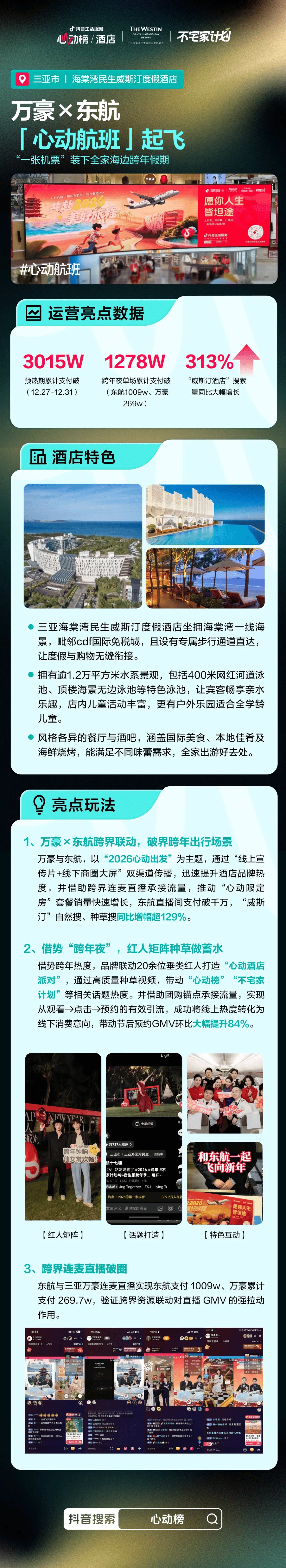 爆发期,两大品牌官方直播间进行跨界连麦,集中推荐“心动限定房”套餐,将前期积累的声量高效转化为生意。其中,东航直播间支付破千万,万豪直播间成交约270万。直播带来的热度进一步外溢,有效带动了短视频渠道的成交。整个活动期间,总成交额超过3000万元。