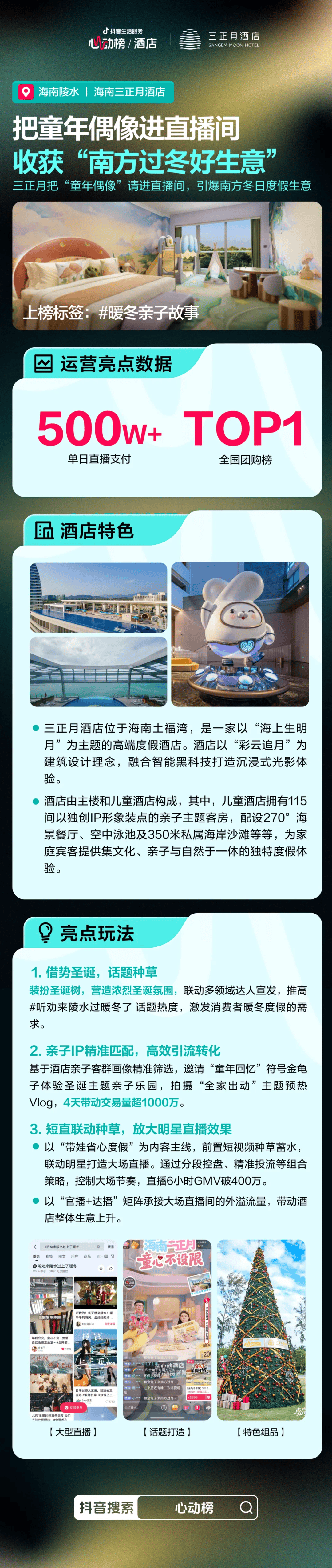 酒店敏锐捕捉北方家庭对暖冬度假需求,借势圣诞节节日热度,营造浓郁节日氛围,并联动多领域达人宣发,推高#听劝来陵水过暖冬了等话题热度;同时,以“带娃省心度假”为内容主线,前置短视频种草蓄水,并邀请“童年回忆”符号金龟子打造大场直播,通过分段控盘、精准投流等组合策略,控制大场节奏,直播6小时GMV破400万,4天带动交易量超1000万。
