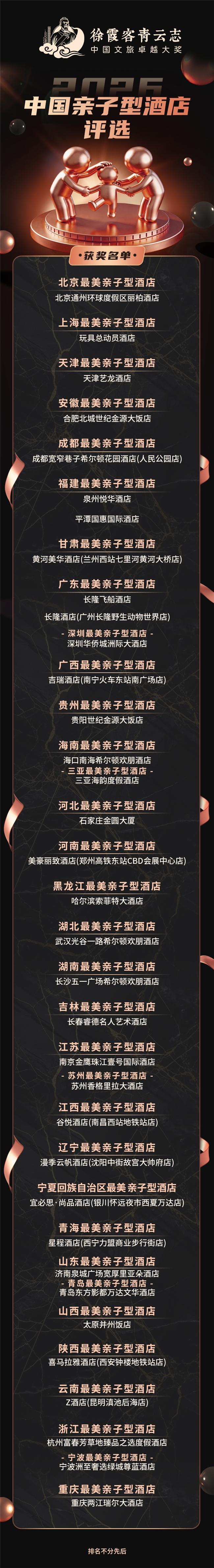 徐霞客青云志中国文旅卓越大奖,以传承徐霞客探索精神、聚焦口碑价值、发掘文旅标杆、赋能产业升级为核心宗旨,覆盖“吃、住、行、游、购、娱”旅游全产业链要素,是国内极具公信力与行业影响力的文旅综合评选IP。本次亲子型酒店专项评选,深度结合家庭出行需求与城市文旅特色,从亲子设施配置、儿童专属服务、安全防护体系、家庭体验活动、在地文化亲子融合、市场口碑等多重维度综合评定,致力于挖掘兼具专业服务能力与家庭友好属性的优质住宿品牌,为广大亲子家庭提供权威、可信的出行住宿参考。